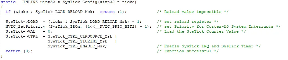 for(i=0; i while(!((SysTick->CTRL) & (1<<16))); } SysTick->CTRL &= ~ SysTick_CTRL_ENABLE_Msk; } void SysTick_delay_us(uint32_t us) { uint32_t i; SysTick_Config(72); for(i=0; i while(!((SysTick->CTRL) & (1<<16))); } SysTick->CTRL &= ~ SysTick_CTRL_ENABLE_Msk; }