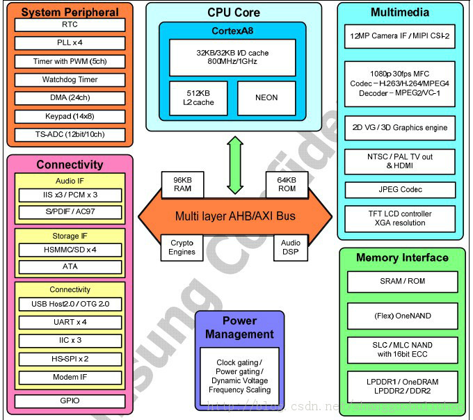 S5PV210的datasheet中有对它的基本架构的一些介绍,里面有这么一幅图