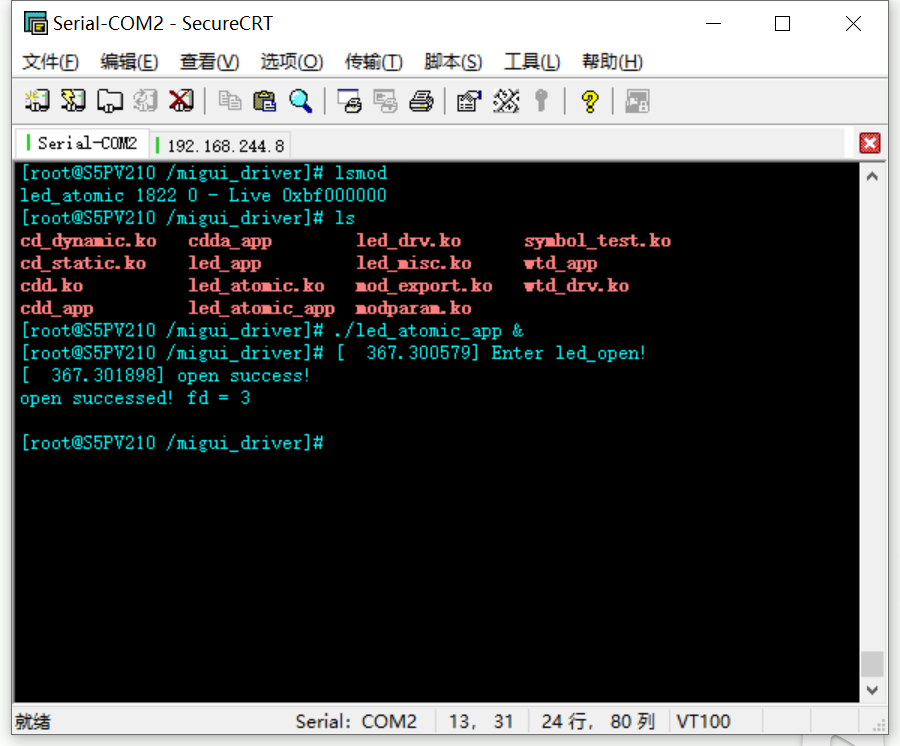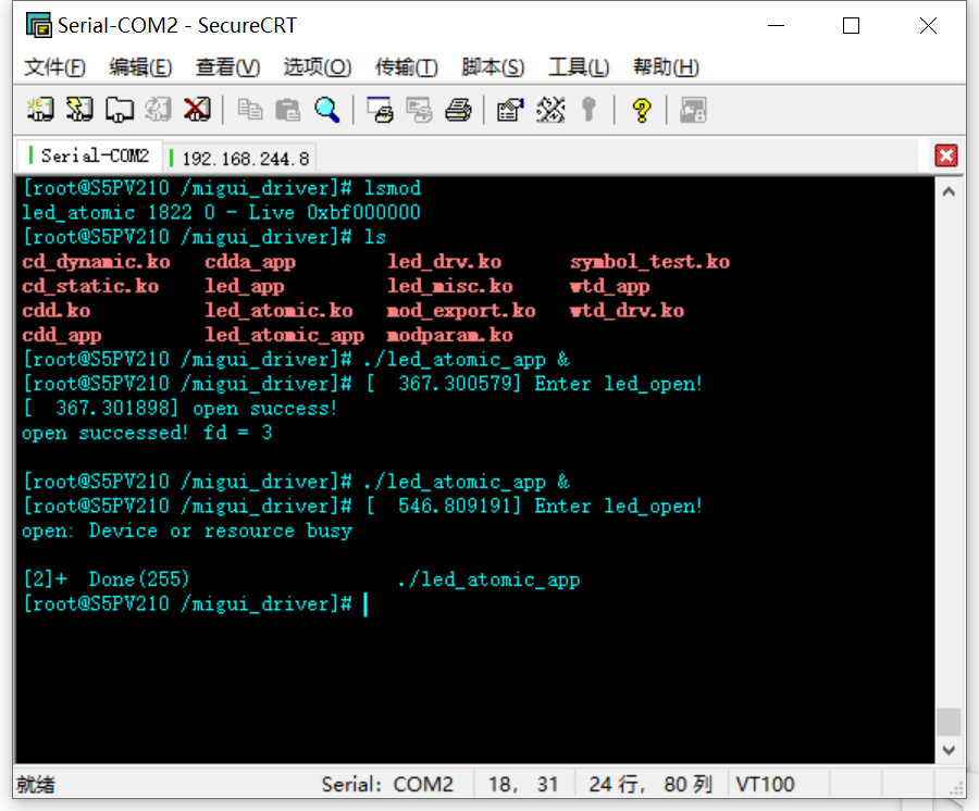 3、在测试驱动模块的原子操作时,需要模拟出多个进程访问的情形,但是用于测试的应用程序只有一个,这时可以在执行该应用程序后加&,使得该应用程序可以一直在后台运行(除了之前kill -9 PID还可以用killall+app结束该app的后台运行),然后再执行一遍应用程序就相当于模拟出第二进程访问的情形,另外一点是,在应用程序打开成功以后直接按回车可以回到命令行,接着继续输入命令。