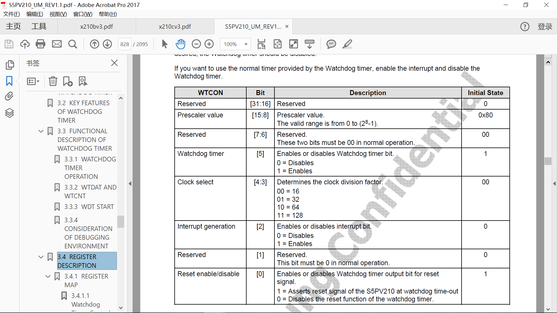 2、在《第八天 01 Linux驱动之看门狗》中所使用的手册是针对s5p6818的,根据视频讲述来看WTCON的[2]和[0]功能是需要互换的,但是经过测试,在s5pv210上还是依照手册来的(也就是s5pv210的WTCON的[2]和[0]功能没有互换),具体可以通过打印WTCON寄存器值即可知道,在s5pv210下,写入完其它位数据但不对WTCON[0]做任何操作,读取到的默认值为0(此时整个WTCON寄存器值为0xff3c,但此时s5pv210并没有重启,为了验证,特地将WTCON[0]写入1,再次测试WTCON寄存器值变为0xff3d,这时s5pv210会重启了)。