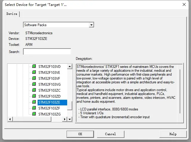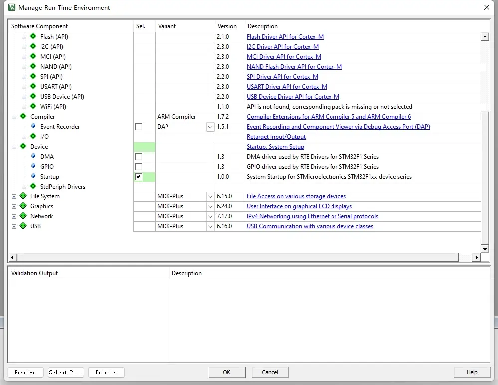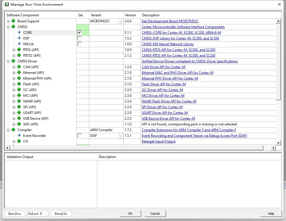 第二步选择启动文件,keil官方给芯片提供了启动文件,按照如下选择,启动文件是汇编语言实现的,主要的功能是定义了堆栈空间,定义了中断向量表,定义了reset函数,即上电后执行的第一个函数,里边具体的内容回头有时间再详细讲解,由于reset函数中调用了系统时钟初始化,所以需要选中固件中的core部分,见下图,如果不选中CORE,则看到select列中为黄色,即有问题,选中CORE之后就显示为绿色