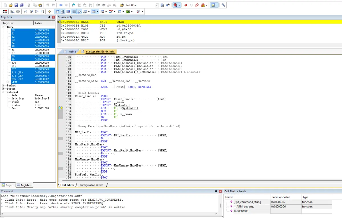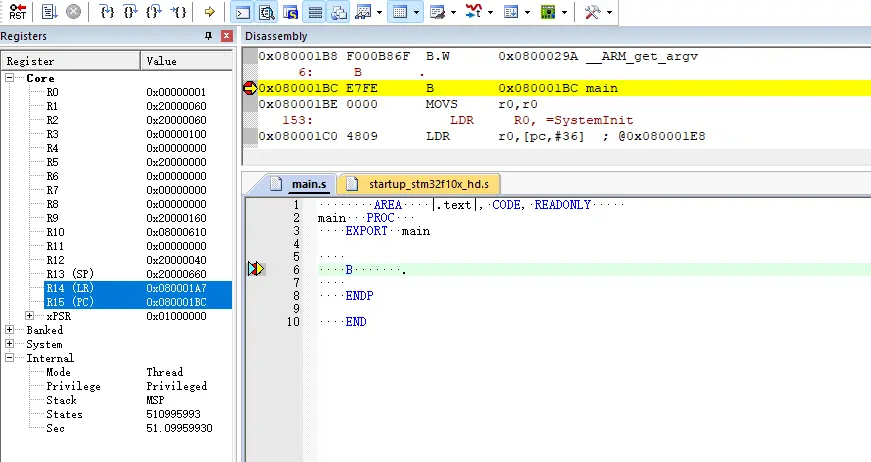 在main.s中的B .行打一个断点,点击开始运行后,会发现会运行到此处,实现了汇编语言的main函数,至此,最简单的汇编工程就搭建好了