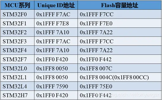 想要读取唯一ID,就需要知道它的存储地址,在不同系列的MCU中地址是有差别的,我们查询了部分MCU的资料并将其总结如下: