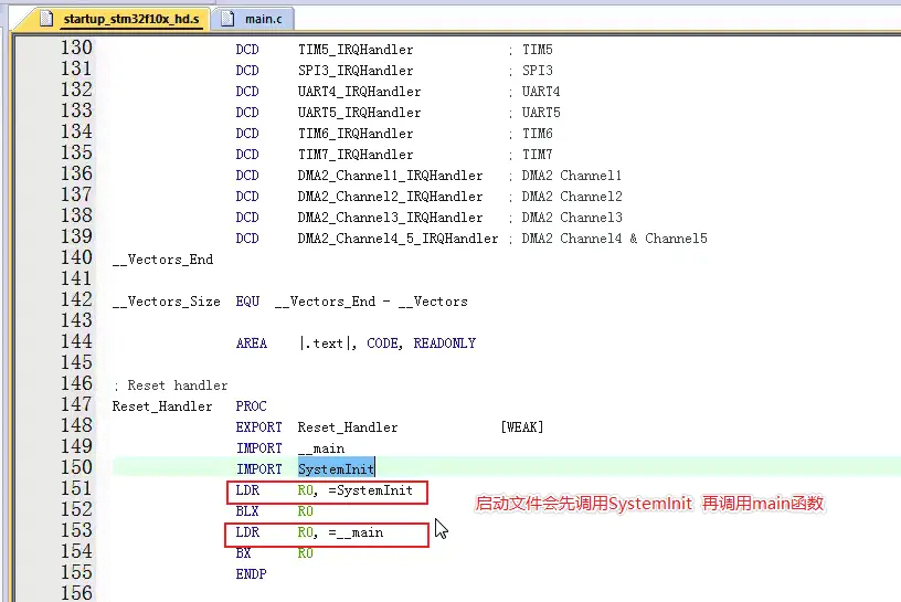 上一篇文章里写了新建工程的过程中,使用了keil提供的文件,也可以不使用,自己手动拷贝,这样工程会更简单一些,只需要拷贝启动文件一个即可,如下界面里不做选择 新建工程的时候不选软件部件 然后直接新建工程,新建完工程后,再去之前的工程中,只将startup_stm32f10x_hd.s文件拷贝过来,放置到新建的工程目录下,然后在界面中加入已经存在的文件,然后新建一个main.s文件,将上篇文章中的代码拷贝过来,如下图 由于没有系统时钟配置部分的c代码,需要修改启动代码中调用了系统时钟初始化的部分,注释掉即可,如下图 注释掉启动文件中的调用系统时钟初始化的部分 然后编译,启动调试,可以看到依然会停到main.s中的B