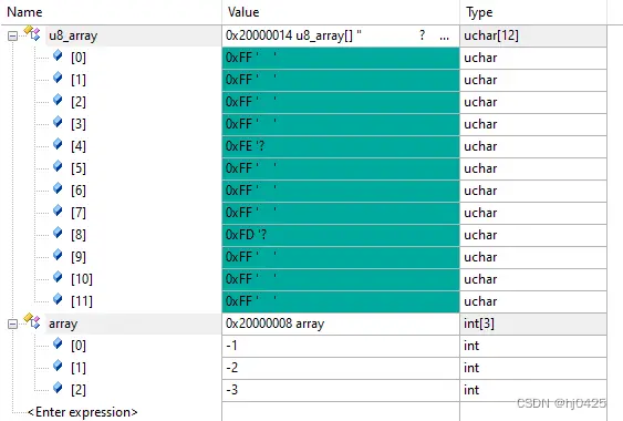 #include #define uint8 unsigned char #define uint16 unsigned short #define uint32 unsigned int #define ARRAY_LENGTH 3 #define ARRAY_LENGTH_DOUBLE (ARRAY_LENGTH*sizeof(ARRAY_TYPE)) #define ARRAY_TYPE int ARRAY_TYPE array[ARRAY_LENGTH]; uint8 u8_array[ARRAY_LENGTH_DOUBLE]; int main(void) { int i; while(1) { for(i=0;i array[i]=-1-i; } for(i=0;i u8_array[i] = ((uint8 *)array)[i];//将数进行拆分 } for(i=0;i array[i]=0; } for(i=0;i array[i]=((ARRAY_TYPE *)u8_array)[i];//将数进行还原 } } } 测试验证 测试条件: 测试结果: 图1 负数拆分 ②将负数进行还原 图2 复数还原