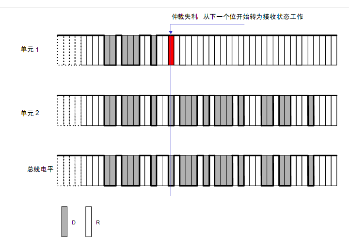 息 ID 的每个位进行逐个仲裁比较。仲裁获胜(被判定为优先级最高)的单元可继续发送消息,仲裁失利的