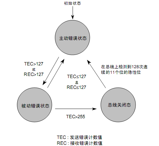 这些状态依靠发送错误计数和接收错误计数来管理,根据计数值决定进入何种状态。