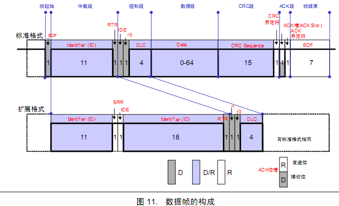 另外, 数据帧和遥控帧有标准格式和扩展格式两种格式。 标准格式有 11 个位的标识符 (Identifier: 以下称 ID) ,扩展格式有 29 个位的 ID。