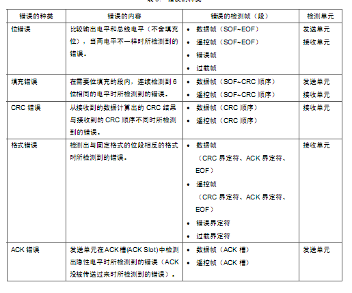 错误的种类、错误的内容、错误检测帧和检测单元如表所示。