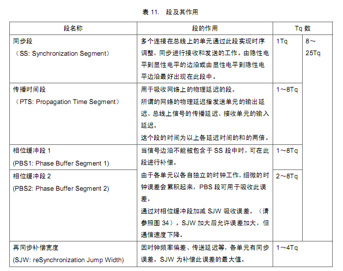 1 位分为 4 个段,每个段又由若干个 Tq 构成,这称为位时序。