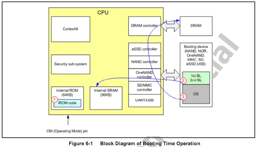 The iROM loads the first boot loader image from a specific booting device to internal 96KB SRAM. The booting device is selected by Operating Mode (OM) pins. According to the secure boot key values, the iROM code may do an integrity check on the first boot loader image.