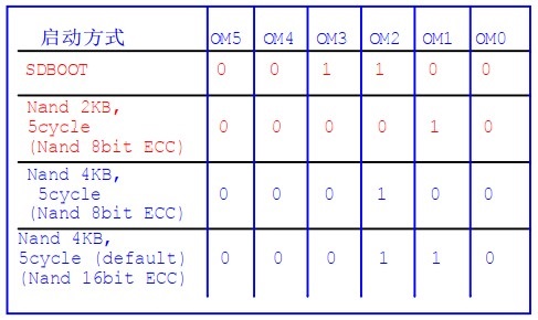 查找到一个表格,有上表可知,OM1/OM2/OM3决定的是从SD卡启动还是从Nand Flash启动。