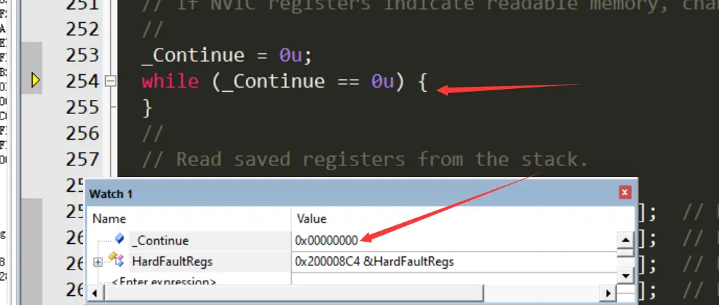 逐次单步运行,最终退出中断函数,返回导致 HardFault 错误的代码处,如下图所示。