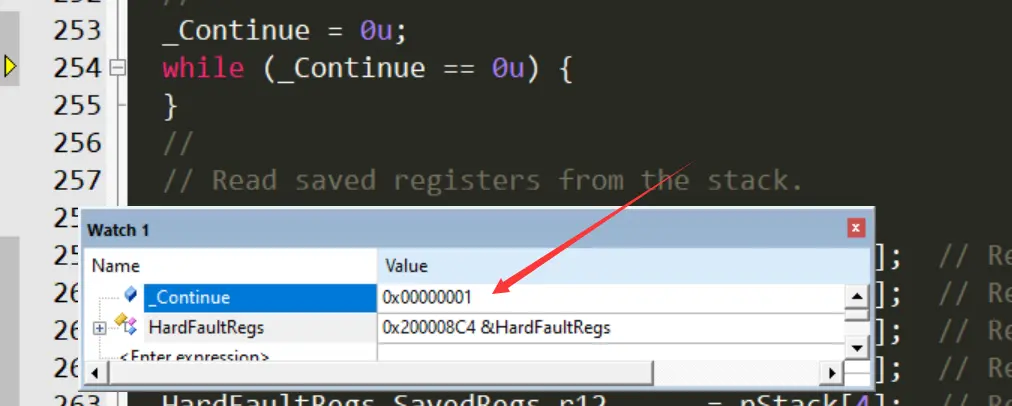 我们在调试窗口将 _Continue 的值修改为任意非 0 值,如下图所示。