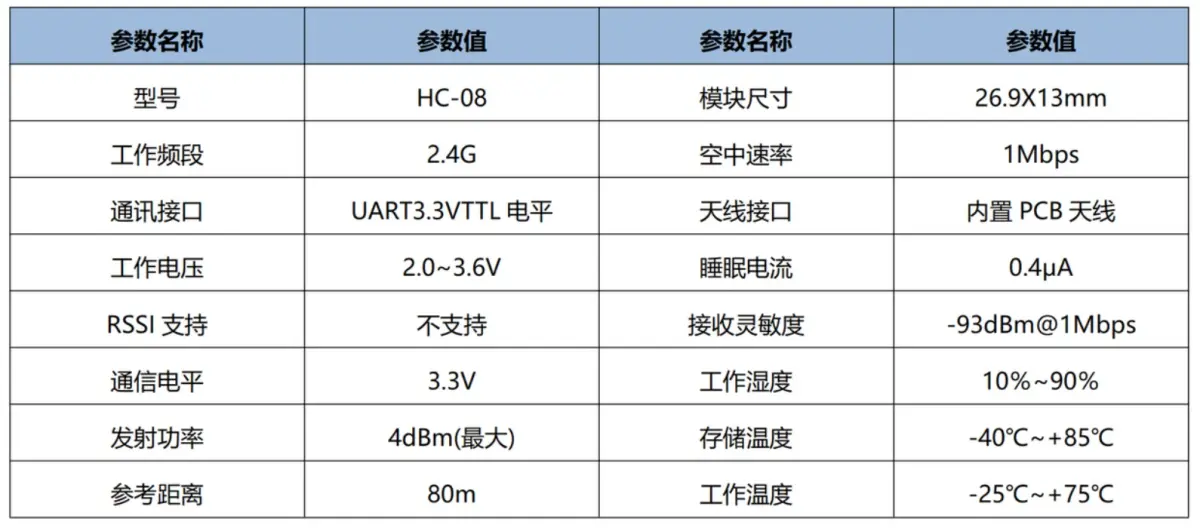 HC-08 采用 TI CC25540 芯片方案,蓝牙 BLE4.0 主从一体,通过 BLE 的软件连接,传输速率 1Mbps ,传输距离 80m ,低功耗,详细参数如下: