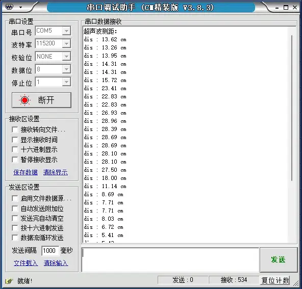 串口输出如下,这是我用本子在超声波前来回移动的数据。记得给板子上电哦,光 STLink 供电可不够。
