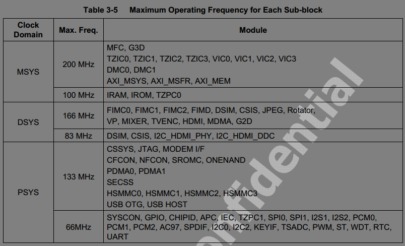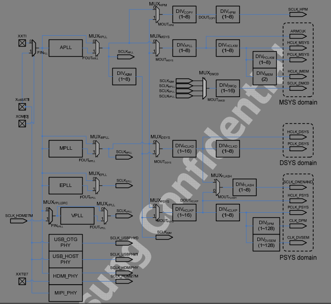 2) DSYS(显示相关的时钟) 用来给显示相关的部件提供时钟,包括FIMC, FIMD, JPEG, and multimedia IPs。