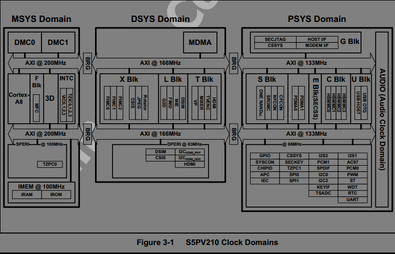 1) MSYS(主系统时钟) 用来给cortex a8处理器,dram控制器,3D,IRAM,IROM,中断控制器等提供时钟。
