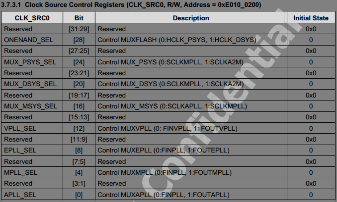 在时钟系统图中,所有的MUX都是用来选择时钟的,相关寄存器是CLK_SRC0