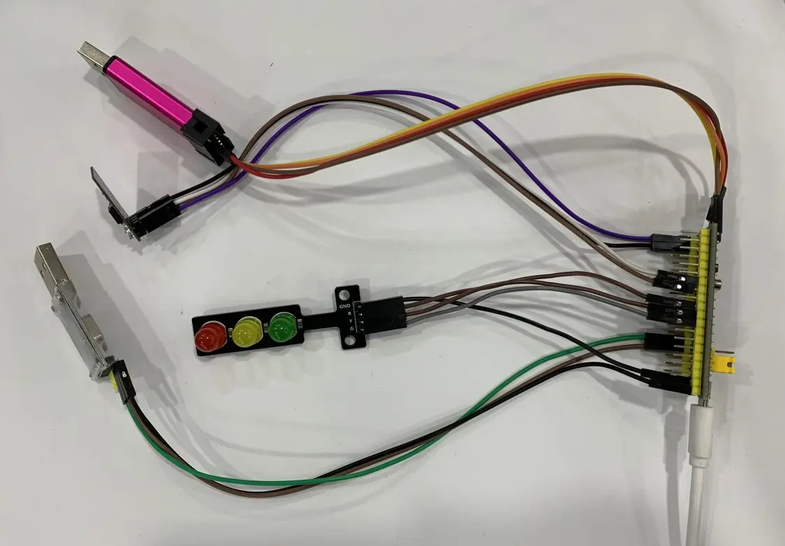 实现目标是我们有一个三色 LED 灯,电脑上使用网络调试助手向 WIFI 模块发送关键词「green」绿灯亮,再次发送「green」绿灯灭,黄灯和红灯的关键词是「yellow」、「red」,效果一样。
