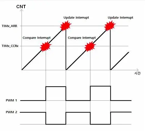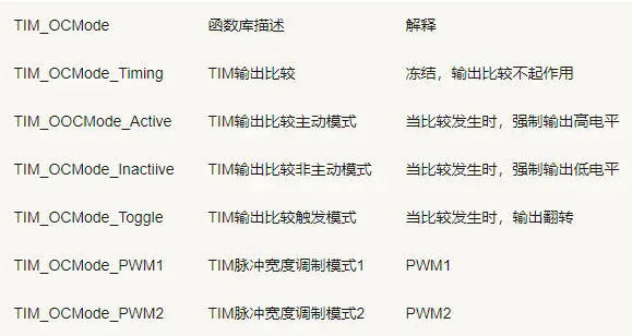 3.PWM(当CNT 4.单脉冲(只输出一个脉冲) 其他工作模式:两个定时器之间还可以构成主从模式、支持针对定位的增量(正交)编码器和霍尔传感器电路、触发输入作为外部时钟或者按周期的电流管理等。 输出比较和PWM的区别: PWM 输出比较 流程: 主从模式(使用一个定时器作为另一个定时器的预分频器)流程图 首先,配置好两个计时器(TIM),然后配置某个TIM为主定时器,接着配置这个TIM的TRGO。然后配置另外一个TIM为从定时器,使用ITRx为内部触发,最后选择从TIM的输入触发源。接下来看看官方文档(《STM32参考手册v10》P278)说明。 使用TIM1作为TIM2的预分频器 此图例子使用的是TIM1和TIM2构成主从模式。TIM1为 主,TIM2为从。 TIMx的内部连接: TIM与TIM之间不是随便连接的,其内部通道是固定的,下表说明了这种关系。 TIM2~5内部触发 TIM1、8内部触发 1、初始化对应IO及各种时钟 2、配置PWM模式,其中ARR根据自己情况设定,占空比CCRx可以固定 3、选择主定时器 ///*///定时器x主模式设置///*/ TIM_SelectMasterSlaveMode(TIMx, TIM_MasterSlaveMode_Enable); 4、选择主定时器触发方式 TIM_SelectOutputTrigger(TIMx, TIM_TRGOSource_Update); //TIM_TRGOSource:触发输出模式 //TIM_TRGOSource_Update:使用更新事件作为触发输出 5、选择从定时器内部通道 ///*///定时器x从模式设置///*/ TIM_SelectInputTrigger(TIMx, TIM_TS_ITRx); //TIM_TS_ITRx中的x要根据上述内部连接表格结合主从定时器来设置 6、设置从定时器触发源 TIM_SelectSlaveMode(TIMx,TIM_SlaveMode_External1); 7、配置完毕,完整代码可看引用链接,特别是嵌入式STM32学习笔记(5)——定时器主从模式,精确输出PWM脉冲数量