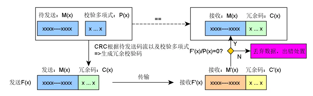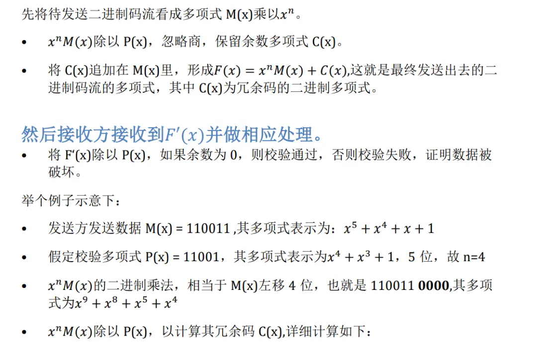 假定待发送有效数据为二进制多项式M(x),而校验多项式P(x)为收发双方约定好了的,双方已知,这里介绍一下几个多项式表示的意思及相关处理流程: