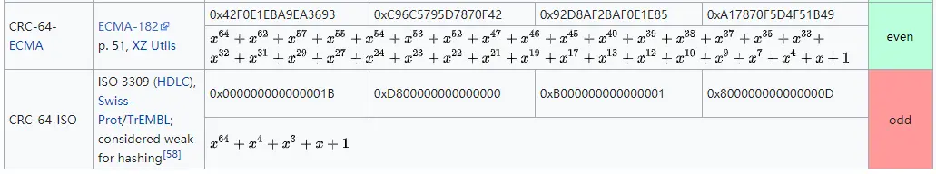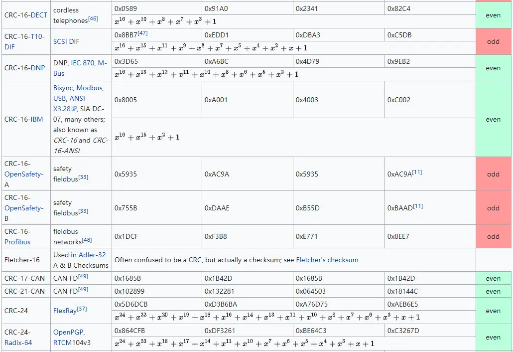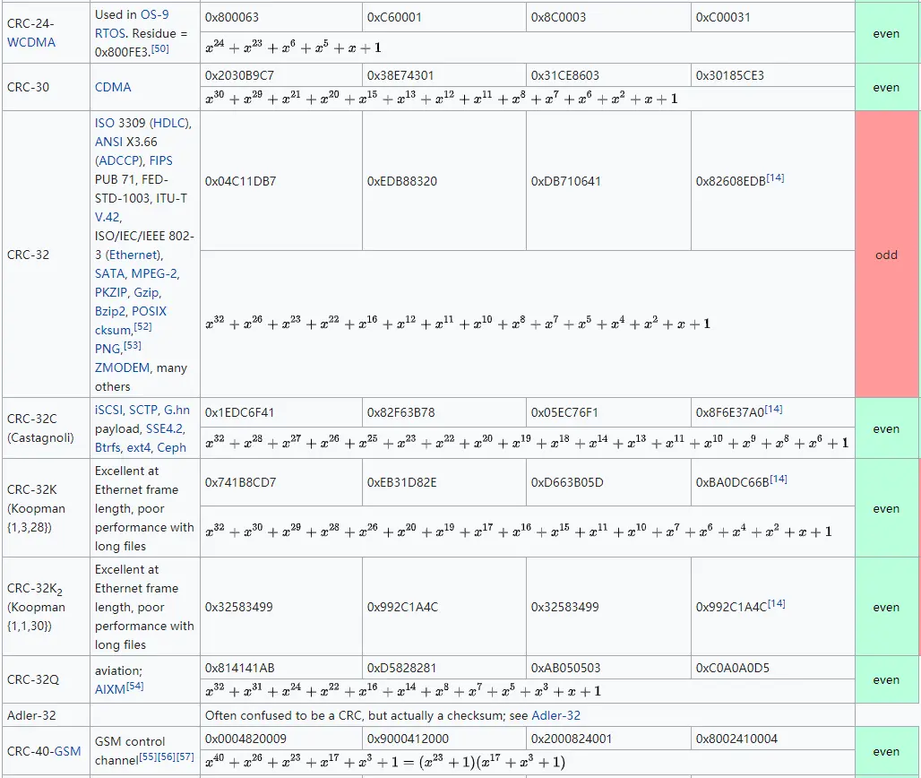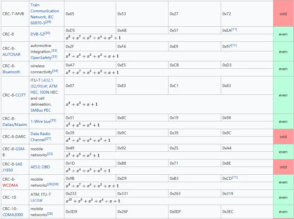 技术发展至今,已有大量不同的校验多项式生成器被各行各业使用。下面是来自wikipedia截图,供大家参考: