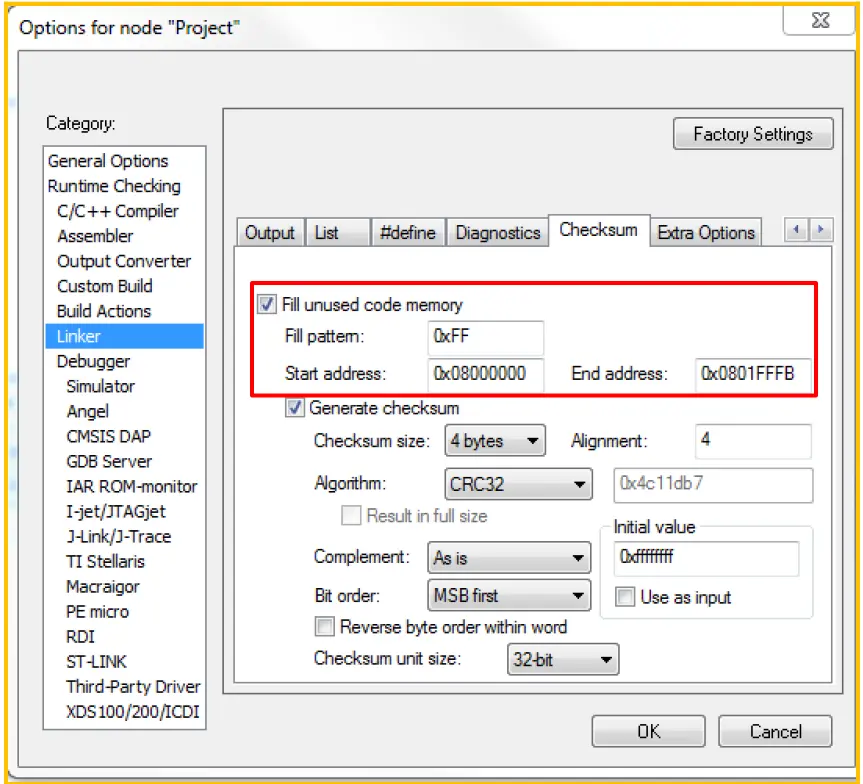 修改 Link 文件,指定 checksum 在FLASH 中的存储位置,在 Link 文件中增加下面语句。