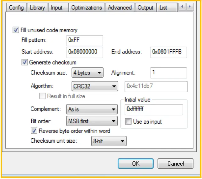 对于IAR v6.4 以下版本,没有”Checksum unit size”选项。参考配置如下: