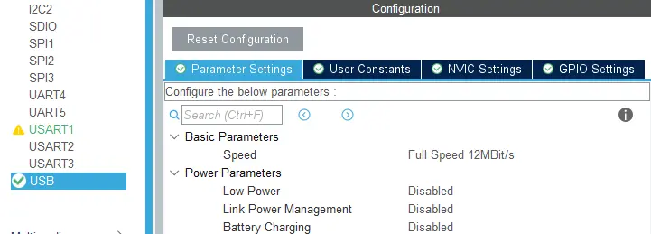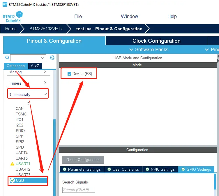 在 Connectivity 中选择 USB 设置,并勾选 Device(FS) 激活 USB 设备。