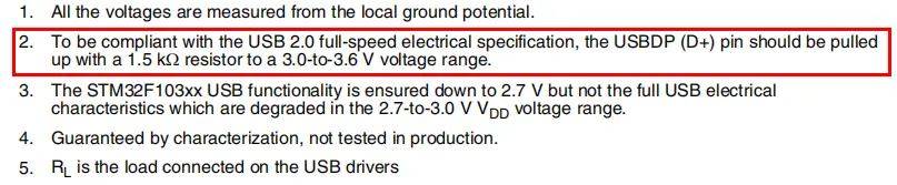 USB 的 DP 引脚必须上拉 1.5K 欧的电阻,电脑才能检测到 USB,否则检测不到。