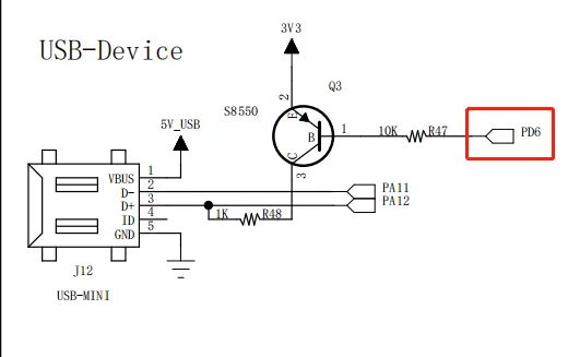 查看野火指南者开发板原理图可知,需要将 PD6 配置为低电平使能 USB。