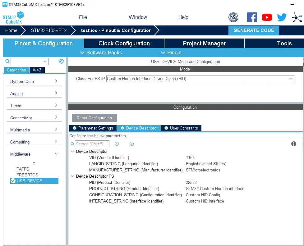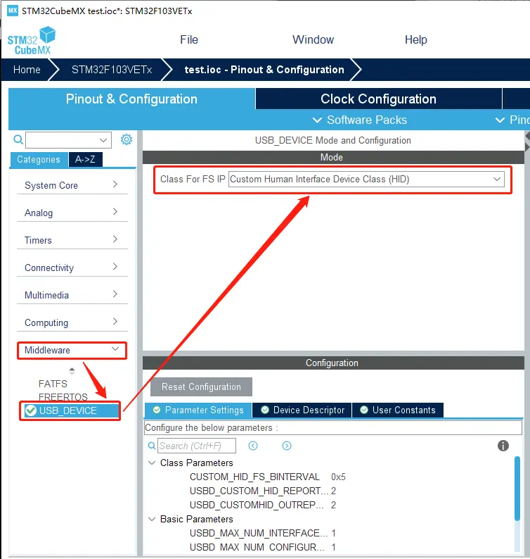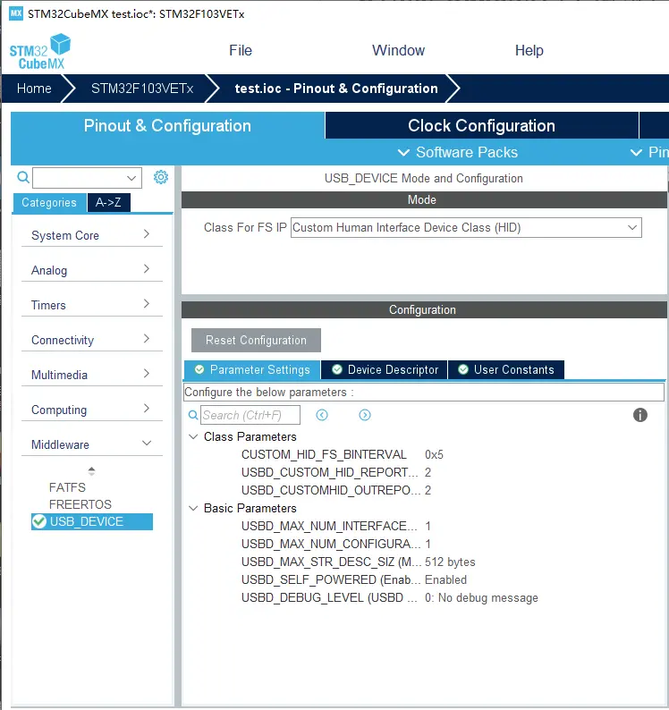 在 Middleware 中选择 USB_DEVICE 设置,在 Class For FS IP 设备类别选择 Custom Human Interface Device Class(HID) 自定义人机接口设备。
