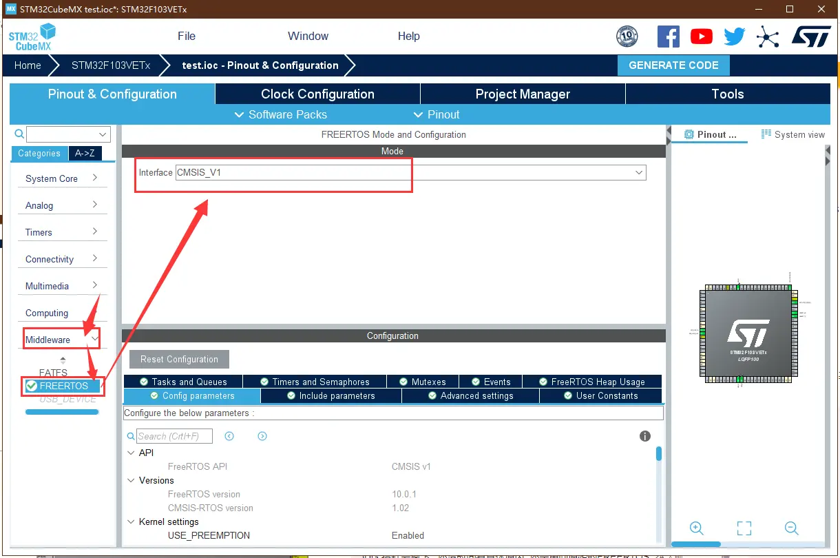 在 Middleware 中选择 FREERTOS 设置,并选择 CMSIS_V1 接口版本