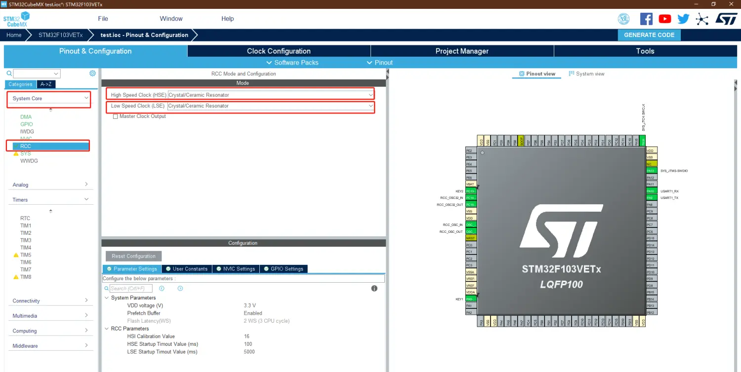RCC 设置,选择 HSE(外部高速时钟) 为 Crystal/Ceramic Resonator(晶振/陶瓷谐振器)