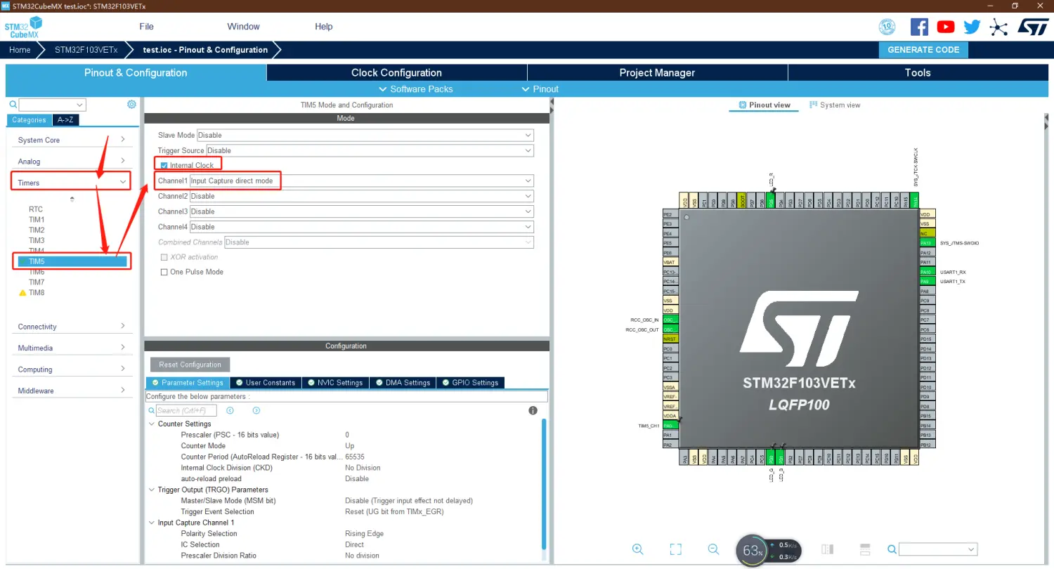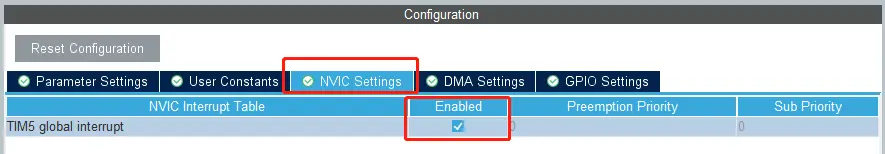 在 Timers 中选择 TIM5 设置,勾选 Internal Clock 使用内部时钟。