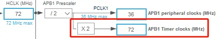 Tclk 即内部时钟CK_INT,经过APB1预分频器后分频提供,如果APB1预分频系数等于1,则频率不变,否则频率乘以2,库函数中APB1预分频的系数是2,即PCLK1=36M,如图所以定时器时钟Tclk=36*2=72M。