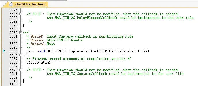 打开 stm32f1xx_hal_tim.c HAL库定时器接口文件,找到输入捕获中断处理回调函数 HAL_TIM_IC_CaptureCallback()