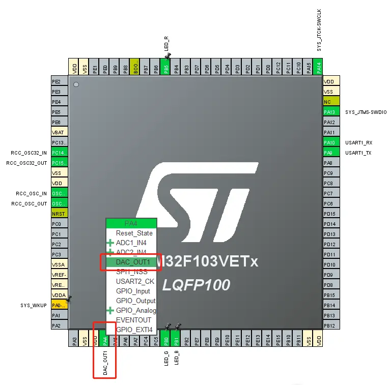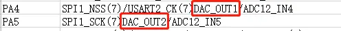或者在右边图找到 PA4 引脚,选择 DAC_OUT1