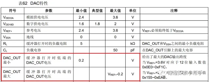 使能输出缓冲后,DAC 输出的最小电压为 0.2V,最大电压为 VREF+-0.2,而未使能输出缓冲则输出可达到0V。