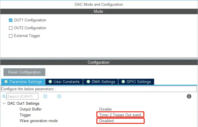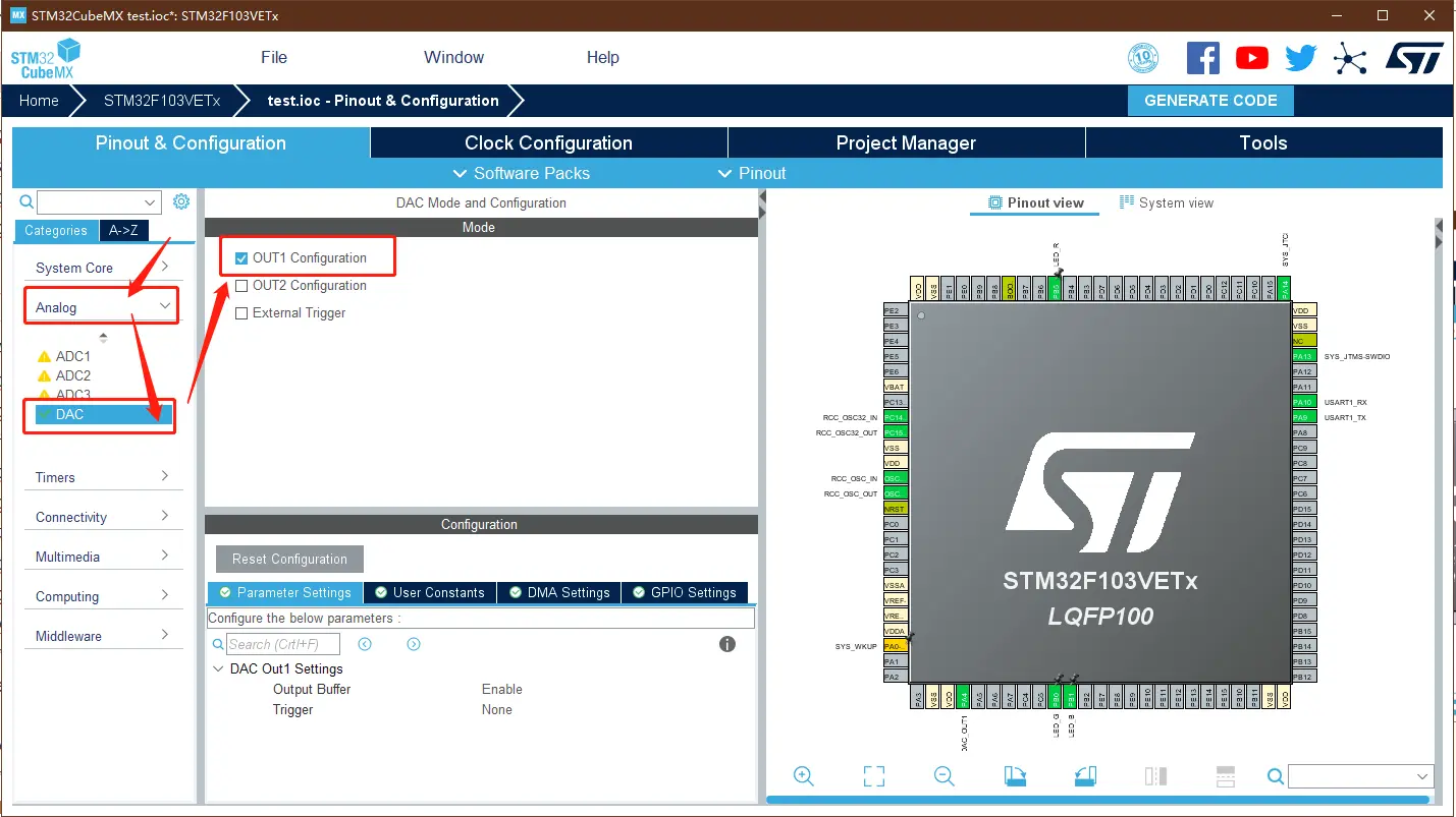 在 Analog 中选择 DAC 设置,并选择 OUT1 Configuration 通道1