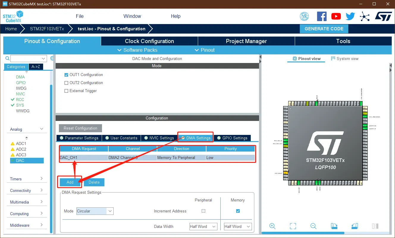 点击 DMA Settings 添加 DAC_CH1 对应 DMA2 的通道3。DMA模式选择循环模式,方向选为内存到外设。