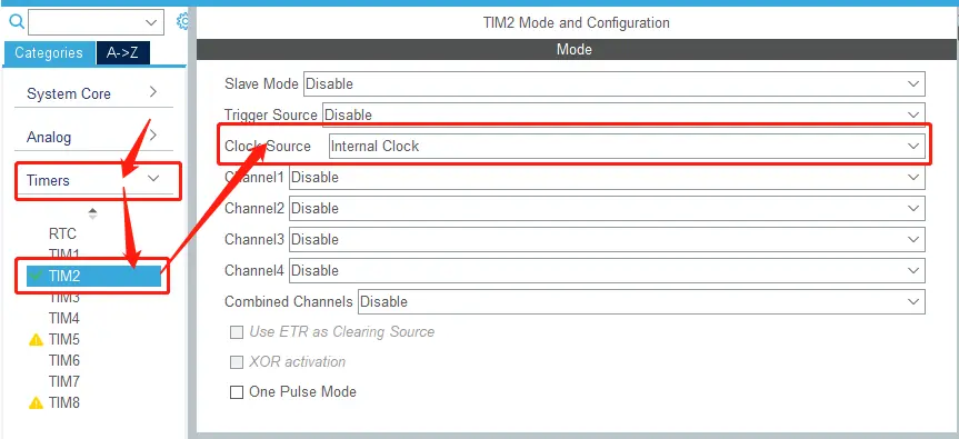 在 Timers 中选择 TIM2 设置,时钟源 Clock Source 选择内部时钟 Internal Clock