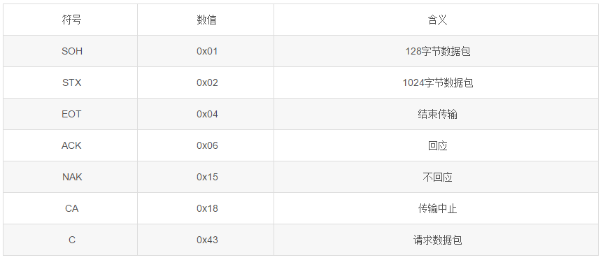 YModem的传输过程就是上面所示。但是上面传输过程中存在许多通信信号,它们的数值与意义如下表所示: