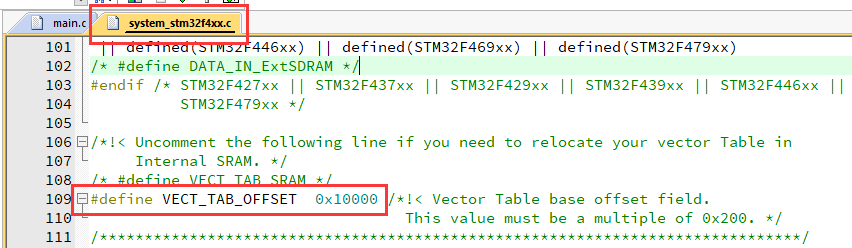 2、更改中断向量偏移地址(system_stm32f4xx.c),中断向量偏移地址 = APP的起始地址