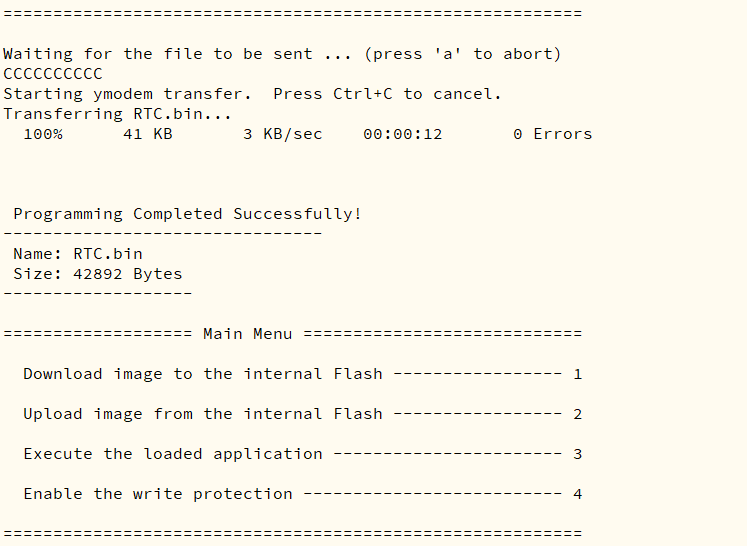 将文件以Ymodem协议发送成功后,会显示文件名、文件大小等提示信息,并且重新进入到Main Menu 菜单界面