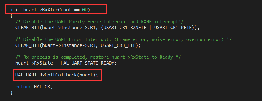 接着我们重新看回 HAL_StatusTypeDef UART_Receive_IT(UART_HandleTypeDef *huart) 函数里的调用回调函数部分,下图所示,发现 RxXferCount 要为0的时候才会调用中断回调函数,依旧以上面例子说明,当MCU误以为上电时的高电平为数据时,上位机再发送5个数据下来,RxXferCount 就永远无法变成0,所以导致一直进入不了中断回调函数。