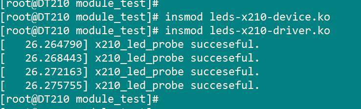 当我们执行第一个insmod的时候,并没有出现后面的4条打印信息,只是执行了leds_x210_init函数(一次insmod只能对应执行一次xxx_init函数,