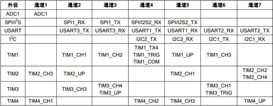 DMA1 各个通道的请求映像