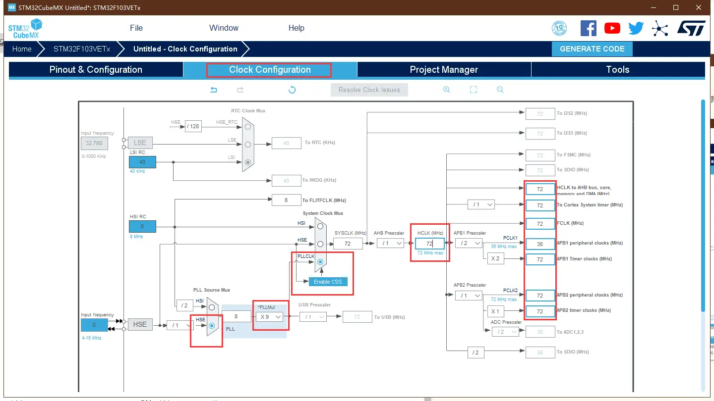 选择 Clock Configuration,配置系统时钟 SYSCLK 为 72MHz